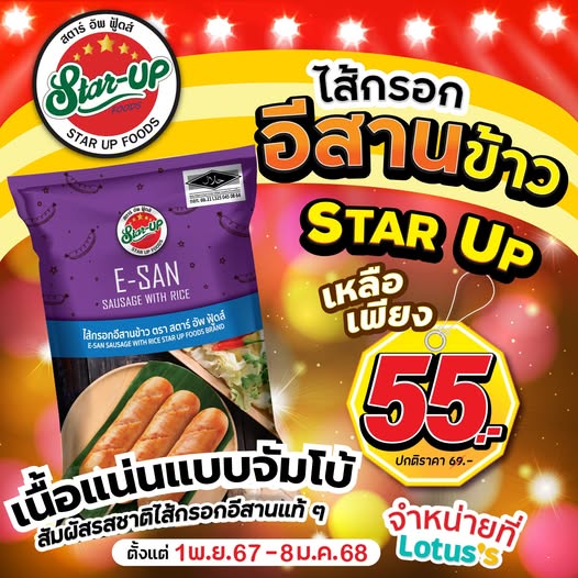 🥳 รสชาติอีสานแท้ ที่คุณต้องลิ้มลอง 📌 กับไส้กรอกอีสานข้าว 🫚 จาก 🌟 Star Up Foods 🌟 เพราะปรุงด้วยสูตรลับเฉพาะ 🤫 หอม กรอบนอก นุ่มใน 📣 มีจำหน่ายที่ โลตัส ทุกสาขา 💸 ราคาแนะนำเพียง 55 บาท ความฟินที่คุ้มเกินราคา! 📌